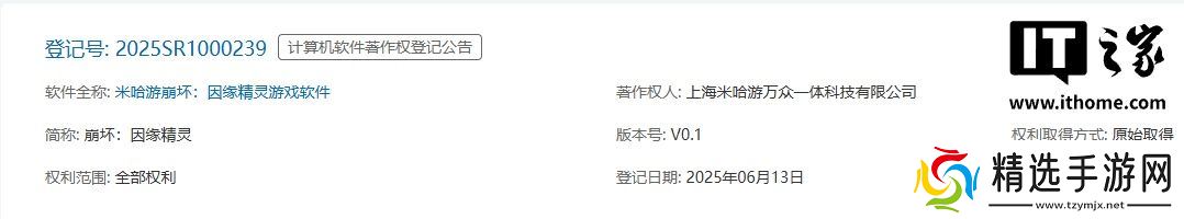 不过,上海米哈游万众一体科技有限公司于 6 月 13 日取得了《崩坏:因缘精灵》软件著作权的全部权利,版本号 V0.1。
