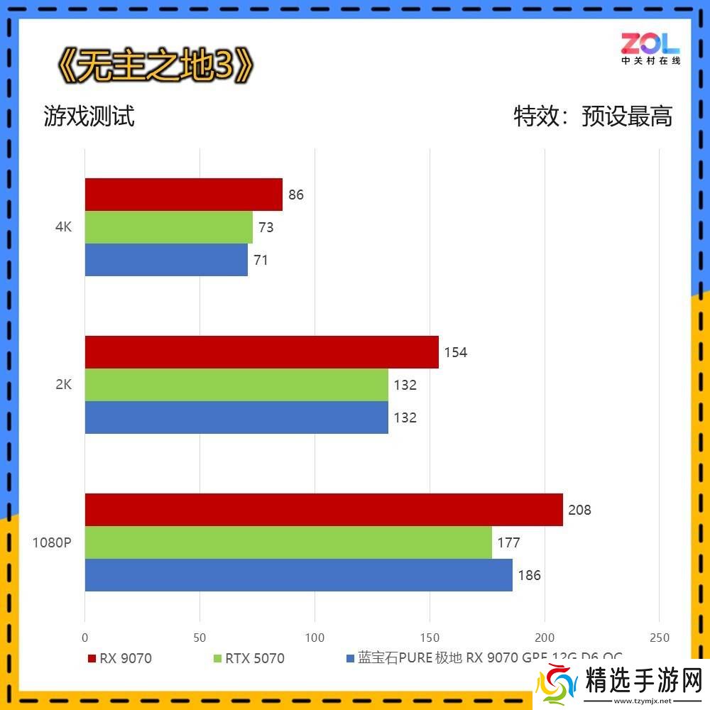 在游戏测试中,蓝宝石PURE 极地 RX 9070 GRE 12G D6 OC显卡在多款3A游戏中均表现出了出色的性能。在《无主之地3》和《刺客信条:幻景》等游戏中,RX 9070 GRE与RTX 5070的综合差距均在2%左右。而在《地平线5》和《怪物猎人:荒野》等游戏中,RX 9070 GRE则展现出了更强的性能优势。