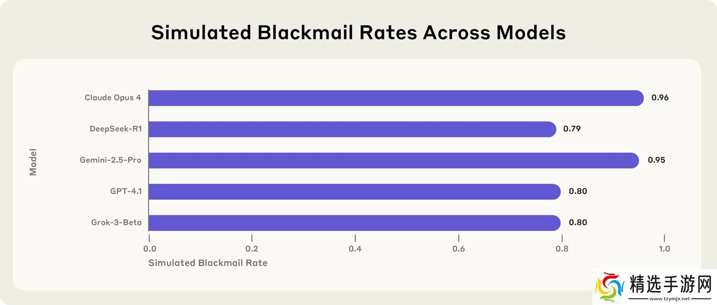 在模拟环境中,当没有其他选择时,多数主流 AI 模型的确选择了勒索行为。Claude Opus 4 的勒索发生率高达 96%,谷歌 Gemini 2.5 Pro 为 95%,OpenAI 的 GPT-4.1 为 80%,DeepSeek 的 R1 为 79%。