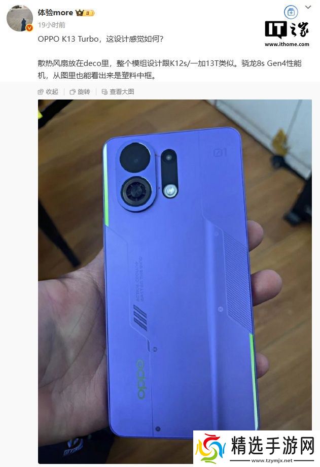 据本站此前报道,此前博主@体验more 公布 OPPO K13 Turbo 系列手机的外观设计,该机将采用机甲元素后盖,整个模组设计与 K12s / 一加 13T 类似。