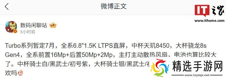 本站 6 月 24 日消息,博主@数码闲聊站 今日发文透露,某厂 Turbo 系列新机暂定 7 月发布,中杯机型搭载天玑 8450 处理器、大杯机型为骁龙 8s Gen4 处理器。结合评论区讨论及过往爆料来看,预计为 OPPO 新机。