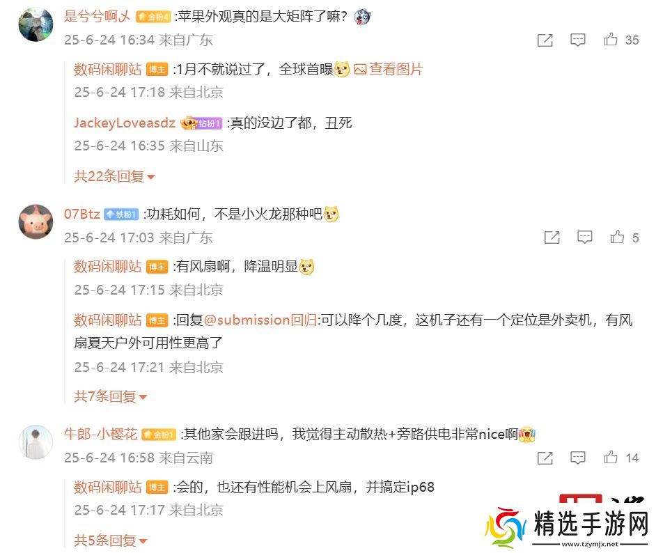 该博主还在评论区回复了部分网友的问题:针对新机功耗、温控如何,他回复“有风扇啊,降温明显”“可以降个几度,这机子还有一个定位是外卖机,有风扇夏天户外可用性更高了”;针对其他厂商是否会跟进,他表示“会的,也还有性能机会上风扇,并搞定 ip68”。