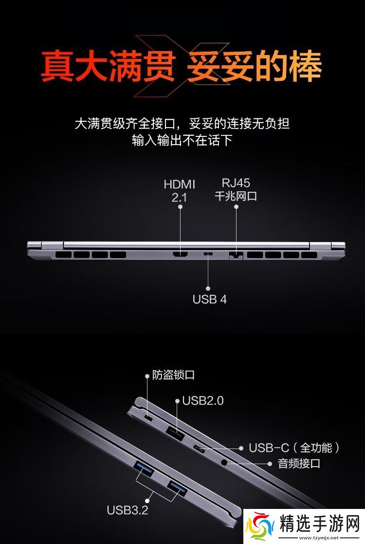 接口方面,该机左侧配备1个 USB-A 2.0、1个 USB-C全功能接口、1个 3.5mm音频接口;右侧配备2个 USB-A 3.2接口;后侧配备 1个 HDMI 2.1接口、1个 USB4接口、1个 RJ45网口。