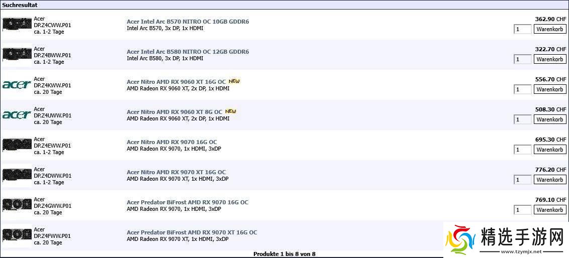宏碁(Acer)的Radeon RX 9060 XT显卡也已在瑞士某零售商上架。其中,RX 9060 XT NITRO OC的8GB和16GB版本分别定价为508.30瑞士法郎和556.70瑞士法郎。令人惊讶的是,尽管它们带有“XT”后缀,价格却比非XT版本的RX 9070显卡低了20%至27%,展现了极高的性价比。