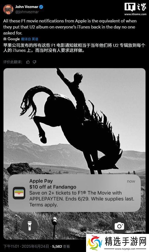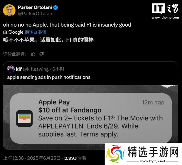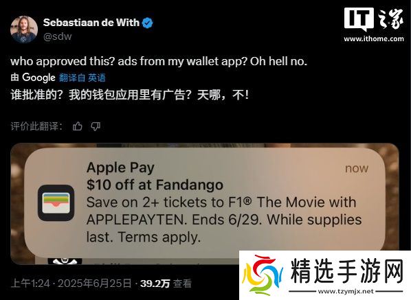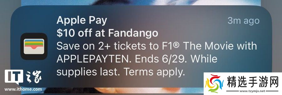 为了确保这部电影在上映首周末取得成功,苹果的营销团队可谓是不遗余力地进行推广。然而,其中一个推广手段却引发了争议。苹果 Wallet 应用向 iPhone 用户发送了推送通知,宣传通过 Apple Pay 购买《F1:狂飙飞车》门票的优惠活动。该活动通过 Fandango 平台提供,用户使用代码“APPLEPAYTEN”购买两张或以上电影票时,可以节省 10 美元(本站注:现汇率约合 71.8 元人民币)。