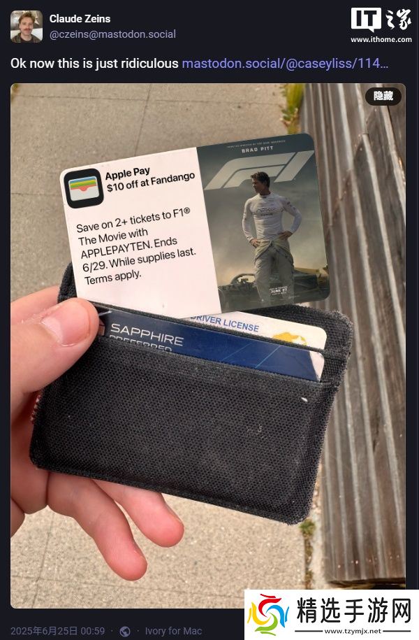 本站 6 月 25 日消息,苹果公司斥巨资打造的好莱坞大片《F1:狂飙飞车(F1 The Movie)》本周末即将在影院上映,而该公司试图通过 iPhone 的 Wallet 应用向用户推广该电影,这一举动引发了用户的强烈不满。