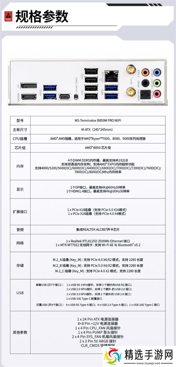 在I/O接口方面,终结者B850M PRO WIFI主板的后置接口包括一个USB 10Gbps Type-C接口、四个USB 5Gbps Type-A接口、四个USB 2.0接口、一个HDMI接口和一个DP接口,同时配备了2.5GbE网口和音频插孔,满足用户多样化的连接需求。