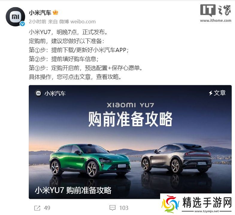 本站 6 月 25 日消息,小米首款 SUV 车型 YU7 即将在明晚 7 点正式发布,官方今日给出购前准备攻略。