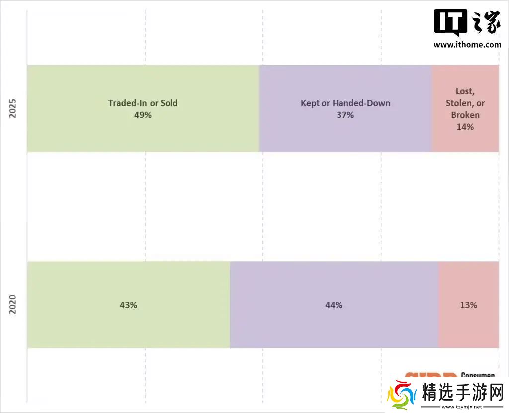 近期,一项由美国消费者情报研究合作伙伴(CIRP)发布的调研结果揭示了iPhone用户在处理旧设备上的新动向。数据显示,在过去的一年里,有接近半数的iPhone购买者(49%)选择了以旧换新或直接出售他们的旧设备,这一比例相较于2020年的43%有了显著增长。