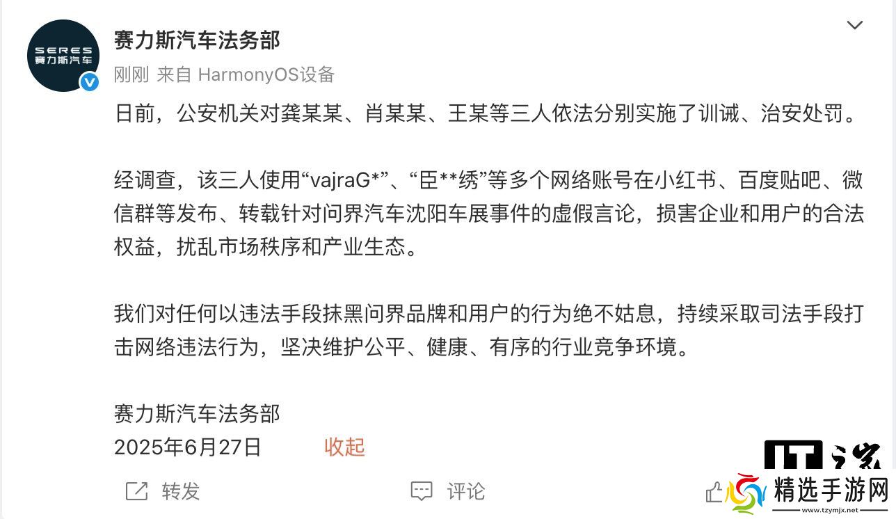 本站 6 月 27 日消息,赛力斯汽车法务部官微今日发文披露,日前,公安机关对龚某某、肖某某、王某等三人依法分别实施了训诫、治安处罚。