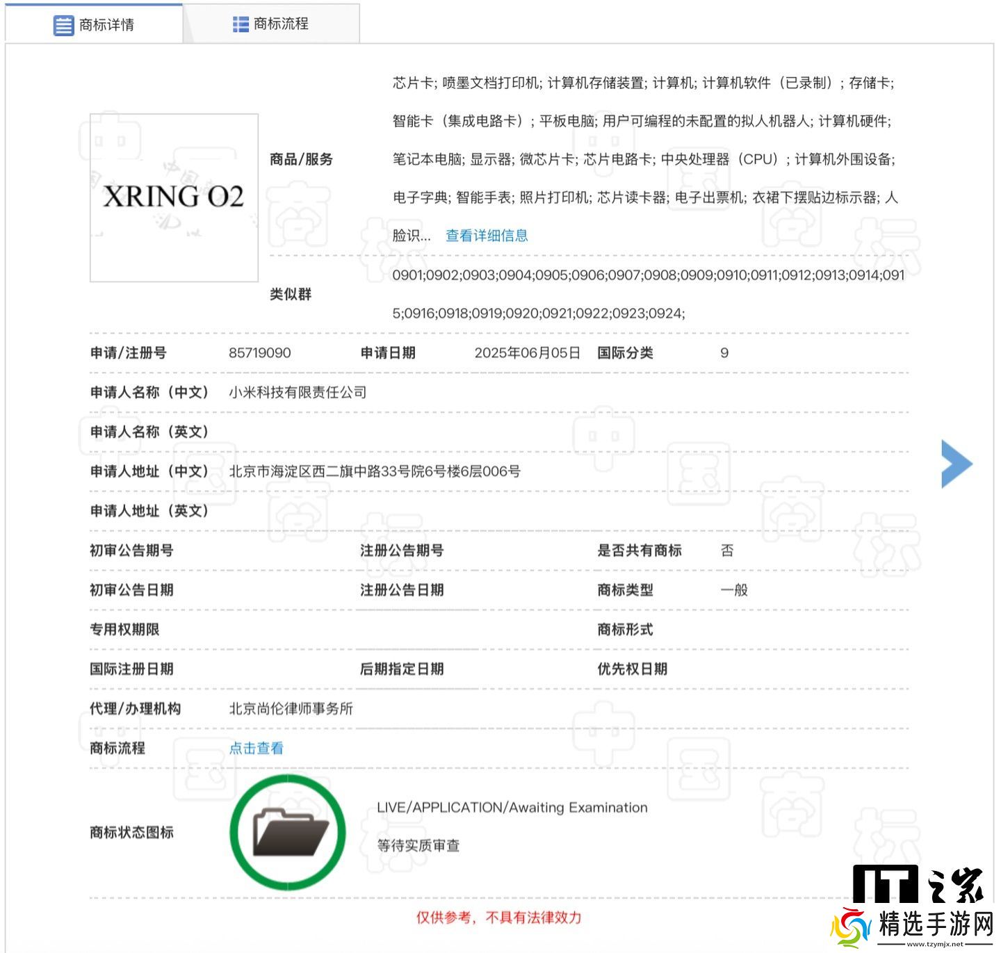 “XRING”即小米玄戒芯片,今年 5 月,小米自研玄戒 O1 / T1芯片发布引发多方关注,而这一“XRING O2”商标显然是小米为下一代玄戒 O2 芯片做准备。