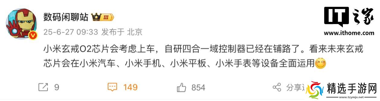 本站 6 月 27 日消息,博主 @数码闲聊站 今日爆料,小米玄戒 O2 芯片“会考虑上车”,小米自研的四合一域控制器已经在为此而做准备。其表示,“看来”未来玄戒芯片会在小米汽车、小米手机、小米平板、小米手表等设备全面运用。