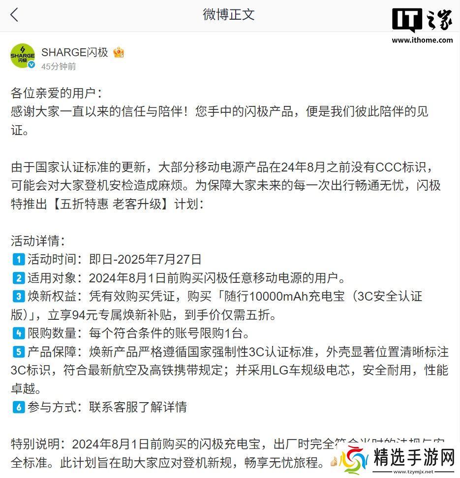 本站 6 月 27 日消息,充电宝品牌闪极今日晚间发文称,由于国家认证标准的更新,大部分移动电源产品在 24 年 8 月之前没有 CCC 标识,可能会对大家登机安检造成麻烦。为保障大家未来的每一次出行畅通无忧,闪极特推出【五折特惠 老客升级】计划: