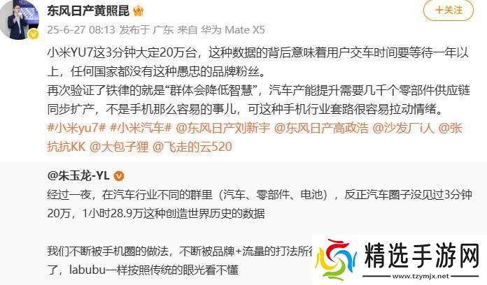 据了解,此前黄照昆在社交媒体上发文指出,小米YU7手机在短短三分钟内大定20万台的数据,意味着用户可能需要等待一年以上的时间才能提车。他进一步评论称,这种“愚忠”的品牌粉丝现象在任何地方都是罕见的,并认为这再次验证了“群体会降低智慧”的观点,认为这种手机行业的营销手段很容易煽动消费者的情绪。