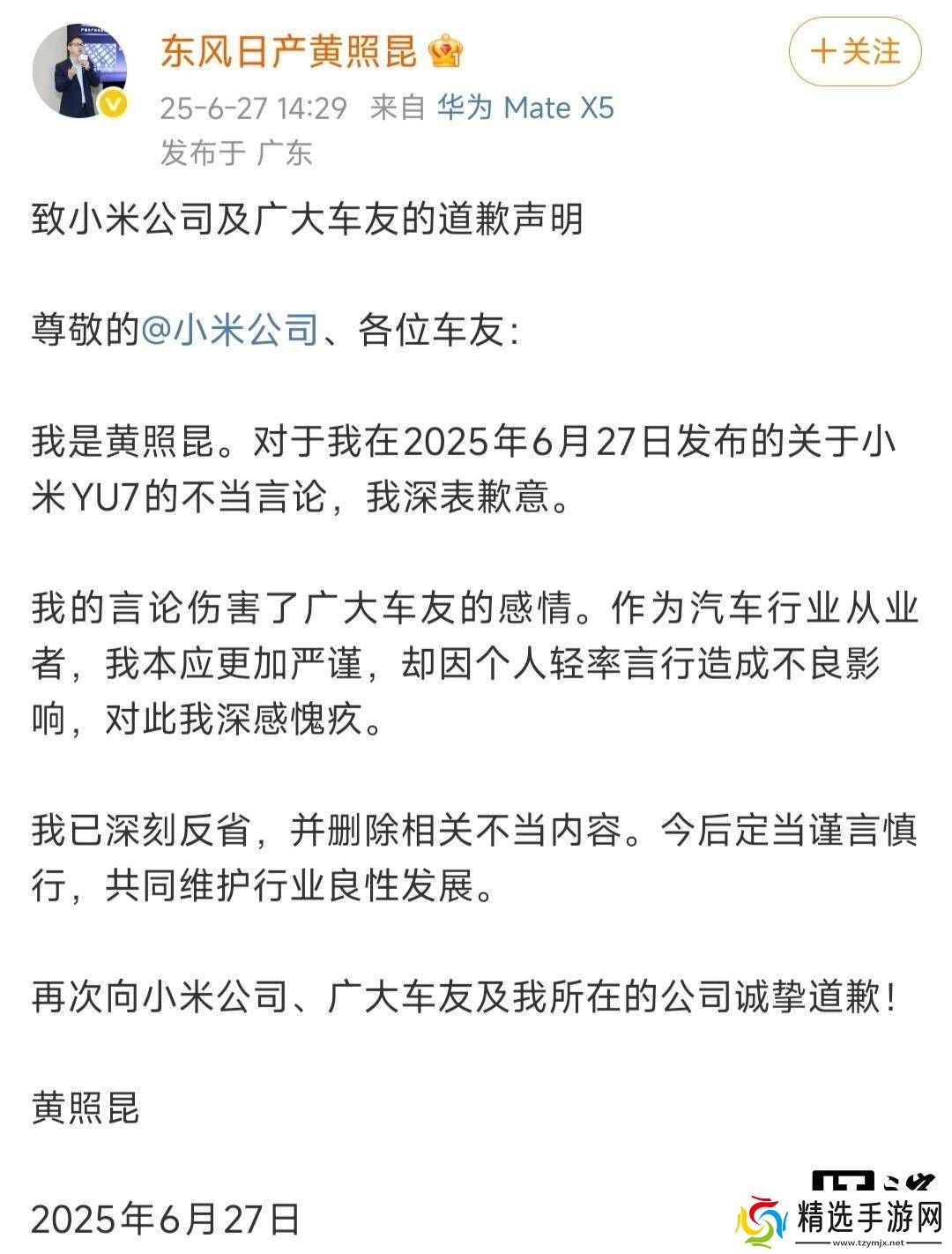 近日,东风日产相关负责人黄照昆就其在社交媒体上发表的关于小米YU7手机的言论表达了诚挚的歉意。在一则公开道歉声明中,他承认自己于某日发布的相关言论存在不当之处,并表示已经深刻反思。
