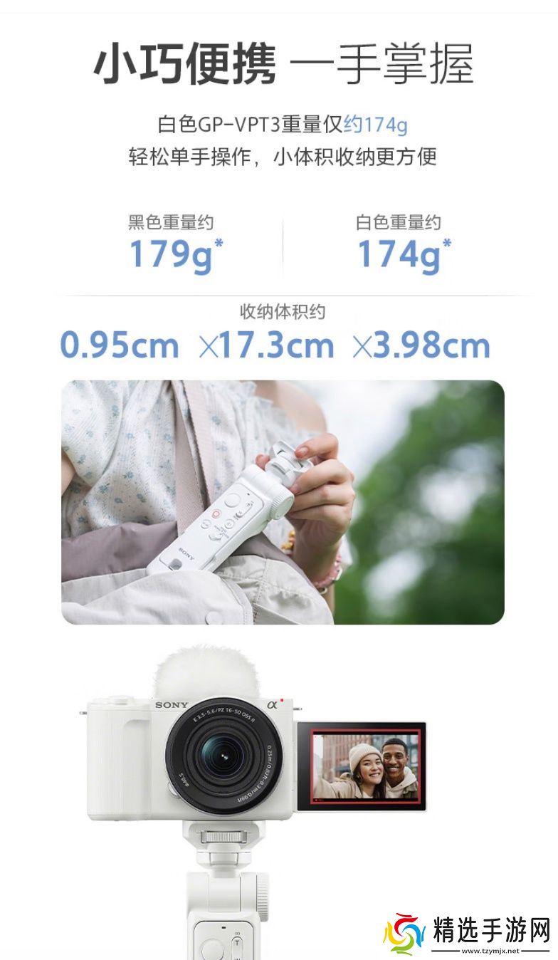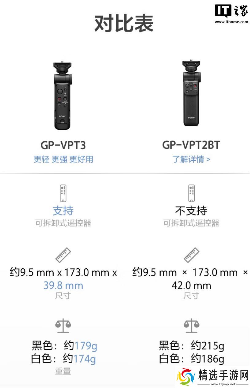 据索尼介绍,该手柄有黑、白两色可选,兼容旗下 α 系列微单相机、ZV 系列、黑卡系列便携相机,黑色版本重约 179 克,白色版本重约 174 克,手柄握持部位采用人体工学设计,支持防尘防水,可提供可靠、舒适体验。