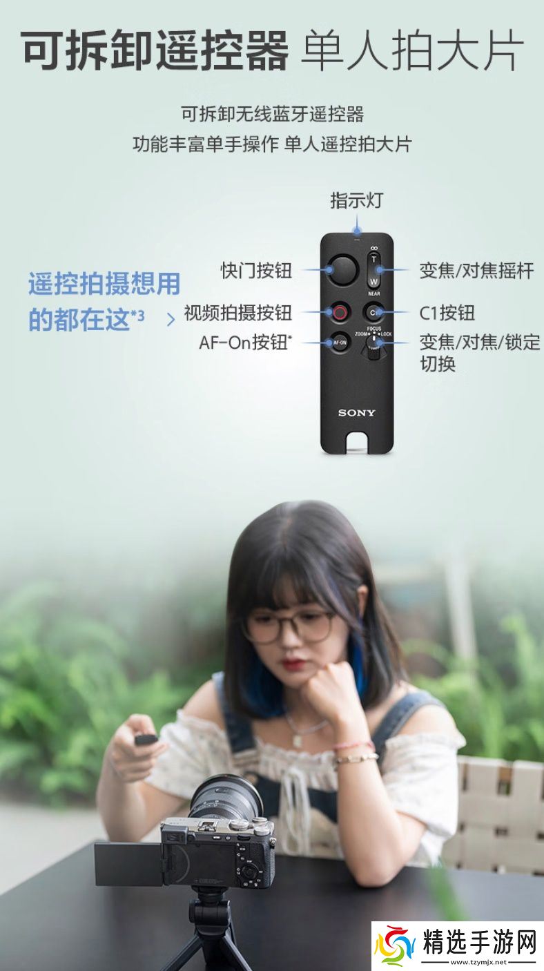 同时,该手柄附有 RMT-VP2 蓝牙遥控器(本站备注:遥控器可单独购买),无线通信距离可达 10 米,前面板有快门、视频录制、AF-ON、C1 键和变焦 / 对焦按钮,支持单手操作拍摄图片或视频,且遥控器上有两颗状态指示灯,用户无需看相机即可了解操作状态。