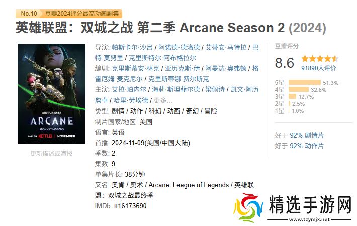动画剧集《英雄联盟:双城之战》第二季在 2024 年 11 月 9 日首播,共 9 集,已于 11 月 23 日正式完结。截至本站发文,该动画剧集目前豆瓣评分 8.6。其中: