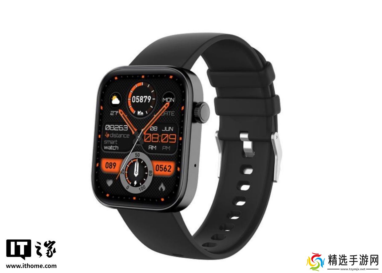 参考相应渲染图,这款智能手表采用 1.9 英寸方形屏幕,右侧提供可旋转的表冠按钮,配备硅胶运动表带,手表支持心率和血氧监测功能,同时支持常规蓝牙通话、音乐控制、闹钟等基础功能,使用触点充电。