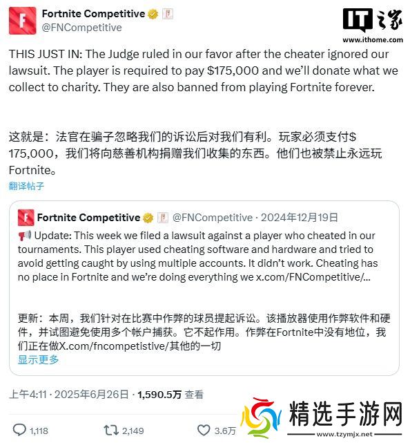 Epic 声称:“因作弊者无视诉讼,法官裁定我方胜诉。该玩家需支付 175,000 美元赔偿金,我们将把所得款项捐赠给慈善机构(Child"s Play)。该玩家同时被永久禁止游玩《堡垒之夜》。”