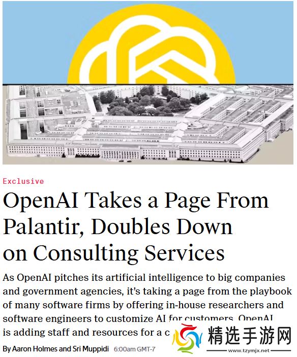 本站 6 月 29 日消息,The Information 刚刚报道称,OpenAI正在效仿 Palantir,加大咨询服务投入,并已与美国国防部、印度**以及 Grab 达成定制化 AI 合作协议。