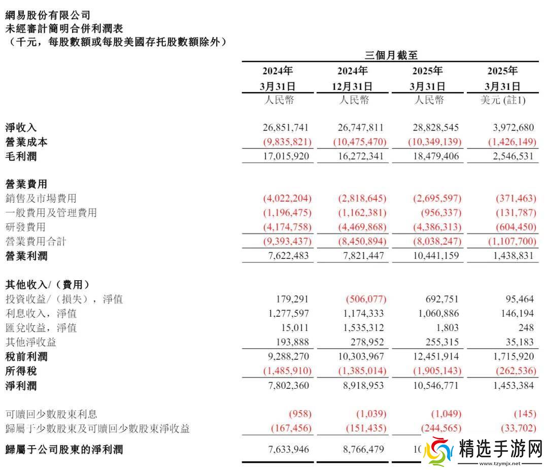 网易近日公布了其截至2025年3月31日的第一季度财务业绩,数据显示这家互联网巨头在纳斯达克(代号:NTES)和港交所(代号:9999)均展现出稳健的增长态势。