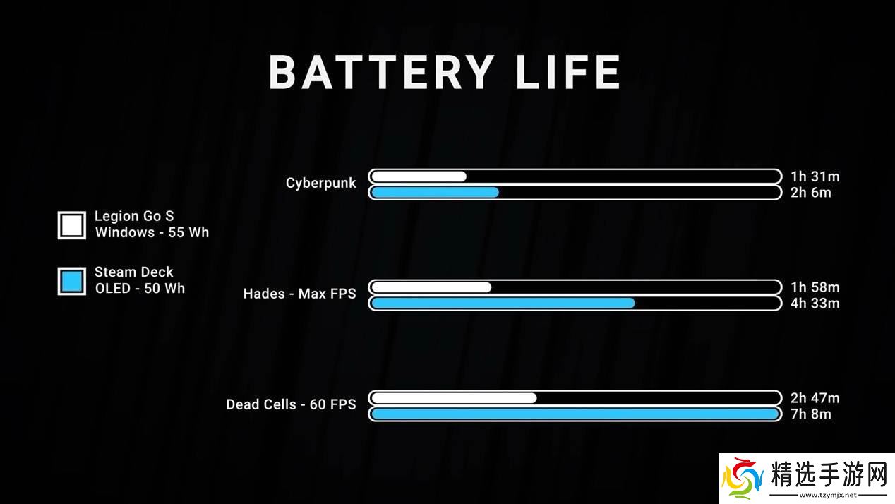 除了帧率表现,Legion Go S在续航方面同样展现出了不俗的实力。在与Steam Deck OLED的对比测试中,尽管Legion Go S的电池容量为55Wh,高于Steam Deck的50Wh,但在运行《黑帝斯》时,Steam Deck的续航时间却达到了联想掌机的两倍以上。在《死亡细胞》中,Steam Deck的续航时间更是比Legion Go S多出4个多小时。这一结果无疑为SteamOS系统的优化能力增添了更多说服力。