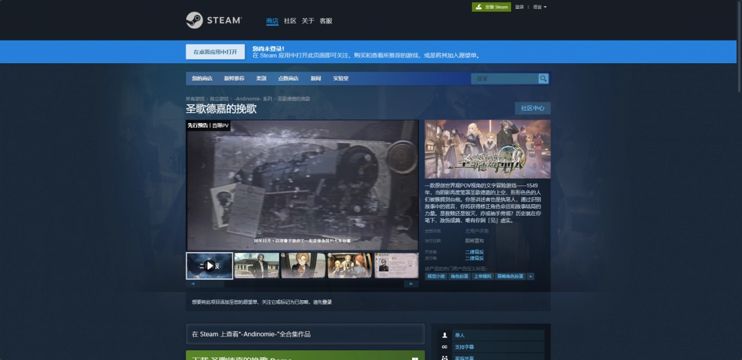 《圣歌德嘉的挽歌》是一款由二律背反开发制作并发行的冒险游戏。而这款游戏的下载网址就是购买平台的购买页面,比如Steam版就是在购买页面购买之后,点击页面中的马上开玩就可以开始下载了。