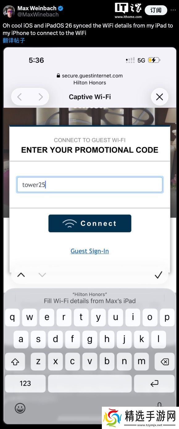 本站 7 月 2 日消息,科技博主 Max Weinbach 今日于 X 平台发文,称苹果为 iOS 26 和 iPadOS 26 新增了一项实用功能:在同一 Apple ID 设备间同步强制门户型 Wi-Fi 网络表单信息。