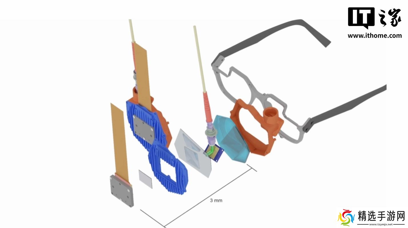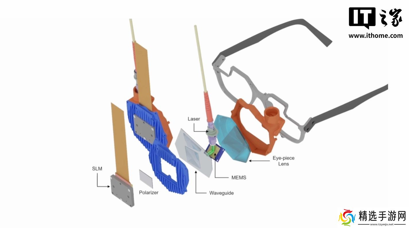 据悉,该原型显示系统采用了微型光纤耦合激光器(分别负责红、绿、蓝三原色),激光光束通过微型高速反射镜(MEMS 镜)引导进入一块定制波导镜片。该波导会将光线扩展并传输至空间光调制器(SLM),最终在眼前重建出全息图像。