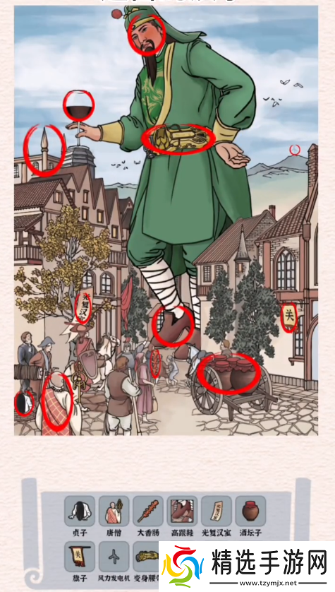 1、关羽梦游记要找的12处不合理分别为:贞子、唐僧、大香肠、高跟鞋、光复汉室、酒坛子、旗子、风力发电机、变身腰带、酱油、关羽、毛笔