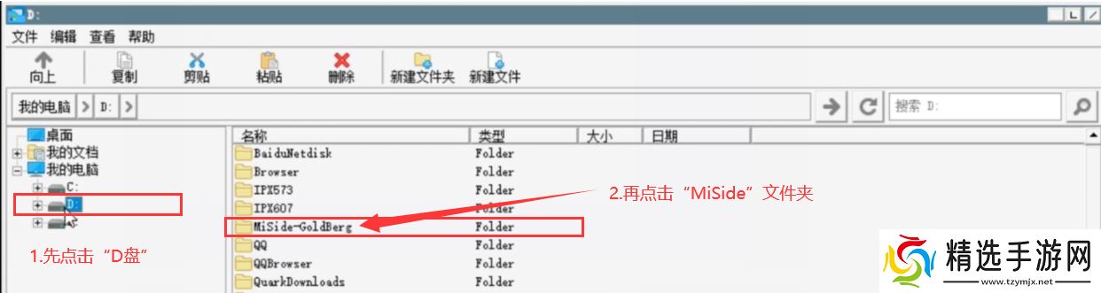 9、先点击D盘,再点击“MiSide-GoldBerg”文件夹(滑动屏幕使鼠标移动到相应的位置后双击屏幕);