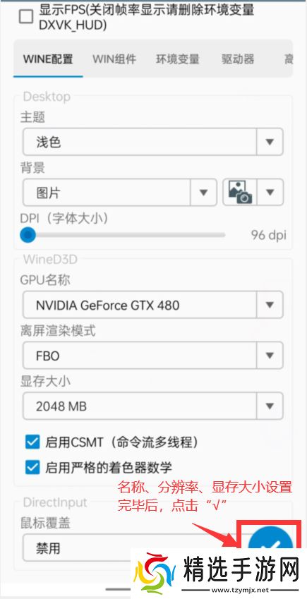 7、名称、屏幕分辨率、显存设置完毕后点击“√”;