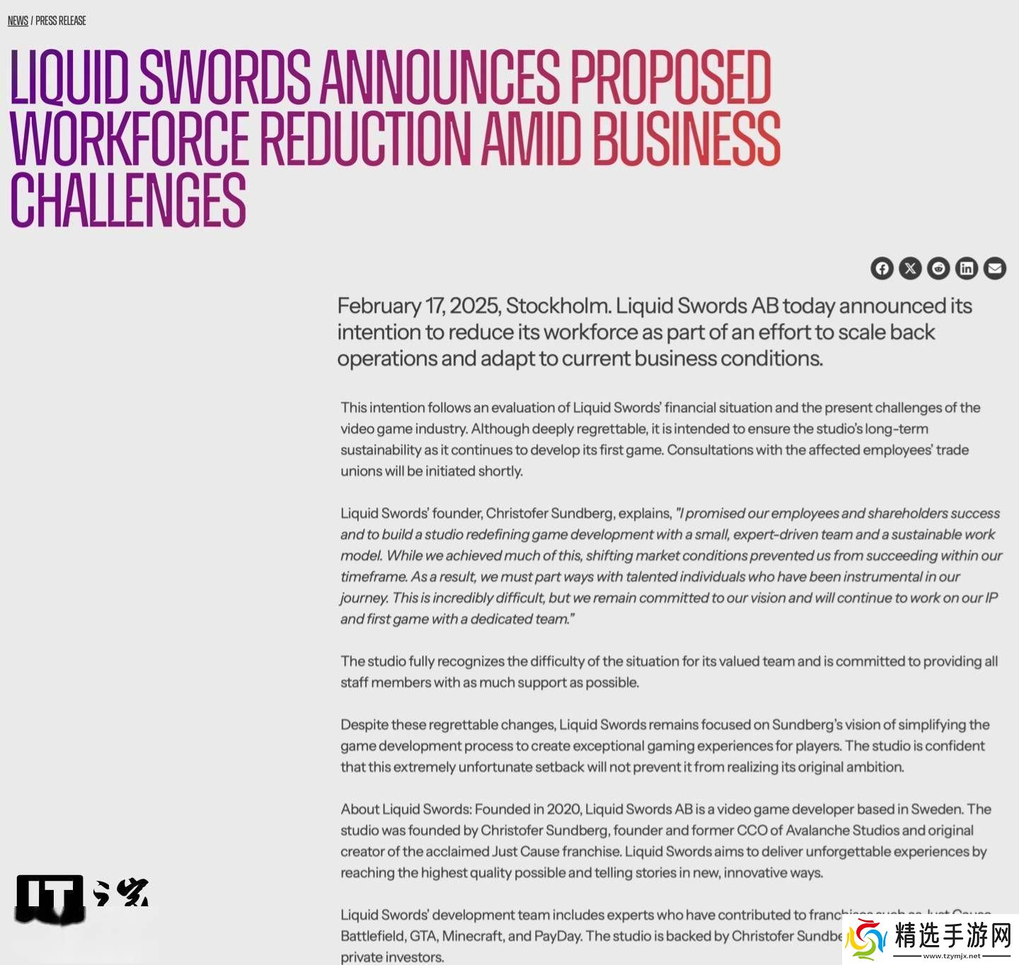 然而,Liquid Swords的工作进程似乎并未如预期般顺利。近日,工作室发布了一则令人意外的声明,宣布将进行内部裁员。声明中,工作室负责人表示,为了寻求更为小型且可持续的发展模式,重新定义游戏开发流程,他们不得不与部分才华横溢的成员分道扬镳。尽管声明中并未透露具体的裁员人数,但这一消息无疑给业界和粉丝带来了不小的震动。