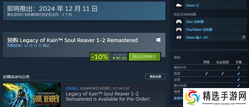 凯恩的遗产1+2复刻版已上架Steam平台,售价108元,现在预购促销仅售97.20元。游戏支持中文,感兴趣的玩家可以关注下。