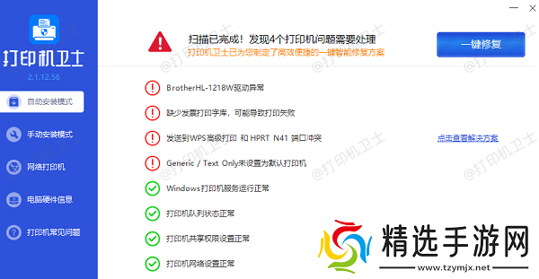 ③、根据检测结果点击“一键修复”软件便会进行下载安装驱动,同时解决修复打印机问题。