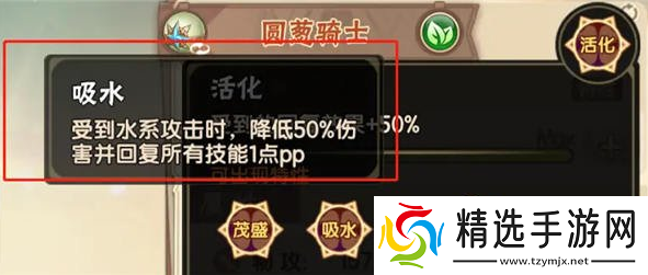 特性选择吸水,降低50%的水系攻击伤害,并回复所有技能的1点PP值,圣灵选择6休憩。没有攻击的回合回复5%的生命值,(小西普们在捕捉小葱的时候可以点击对应精灵查看特性,直接捕捉带有“吸水“”特性的精灵”)