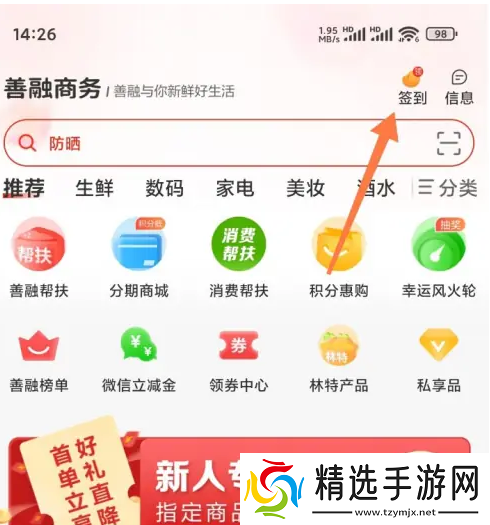 打开善融商务在首页找到【签到】。
