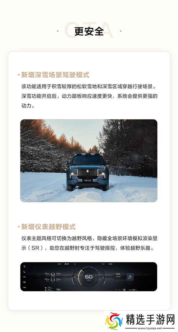 此次OTA升级中,最令人瞩目的新增功能当属深雪场景驾驶模式。这一模式专为雪地路况设计,通过精确调整动力输出与扭矩分配,确保了车辆在深雪环境下能够平稳起步、安全行驶,有效防止打滑,为冬季在北方地区驾驶的车主提供了坚实的保障。