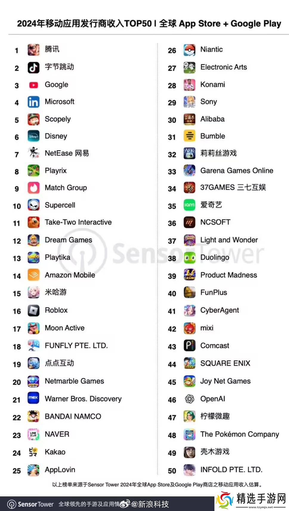 近日,全球移动应用市场的年度盛事再度来袭,Sensor Tower权威发布的《2024年全球移动发行商收入TOP50》榜单震撼公布。