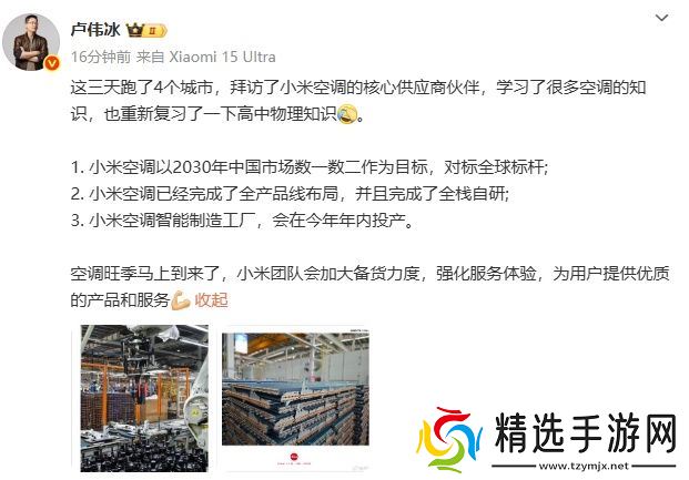 本站 4 月 26 日消息,小米集团合伙人、总裁卢伟冰今日发文称,小米空调以 2030 年中国市场数一数二作为目标,对标全球标杆;小米空调已经完成了全产品线布局,并且完成了全栈自研;小米空调智能制造工厂,会在今年年内投产。