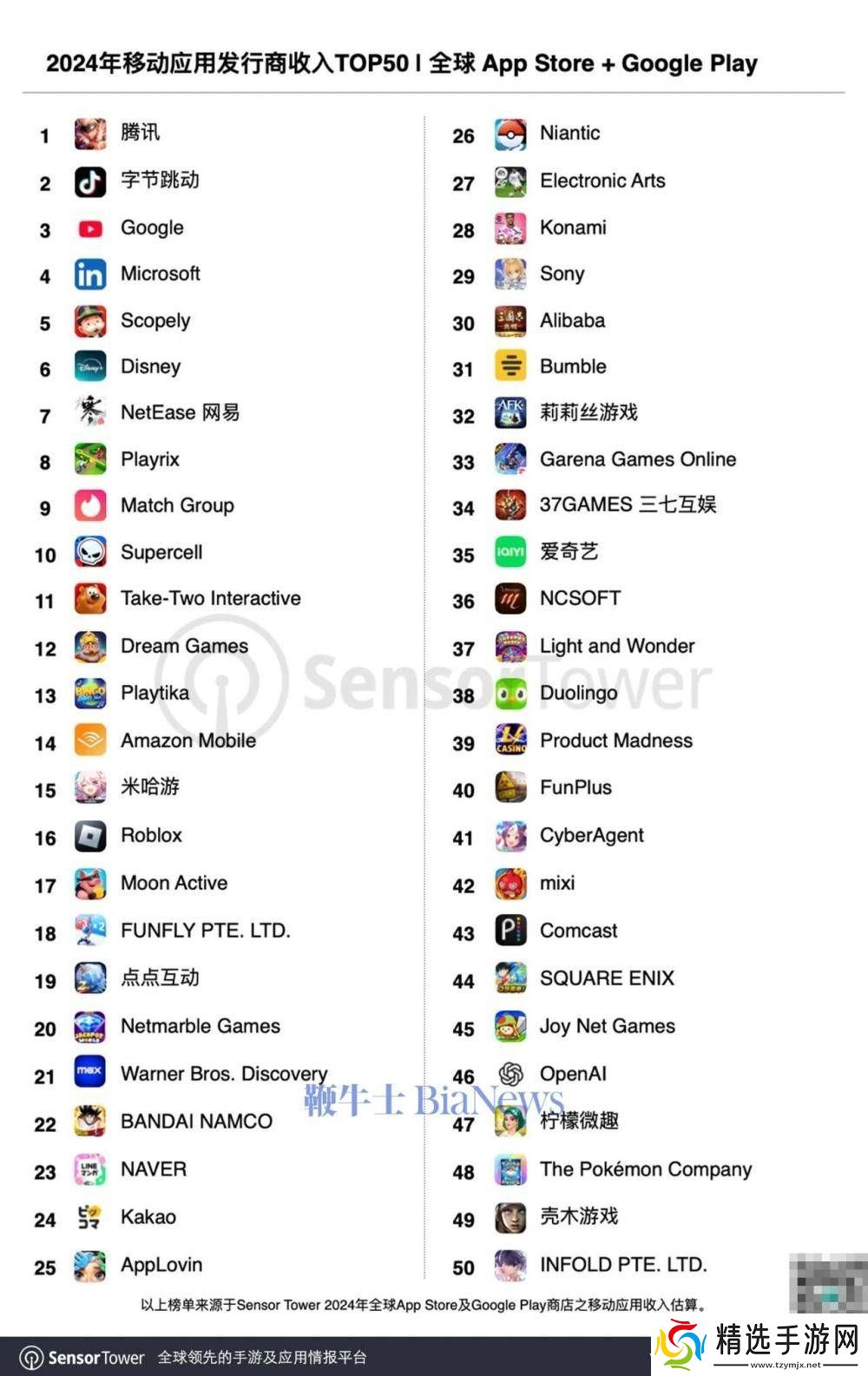 在榜单的顶尖位置,腾讯依然稳坐冠军宝座,这得益于其在游戏与社交等领域的全方位布局。凭借这些优势,腾讯在全球移动应用市场中持续保持其领导者的地位。