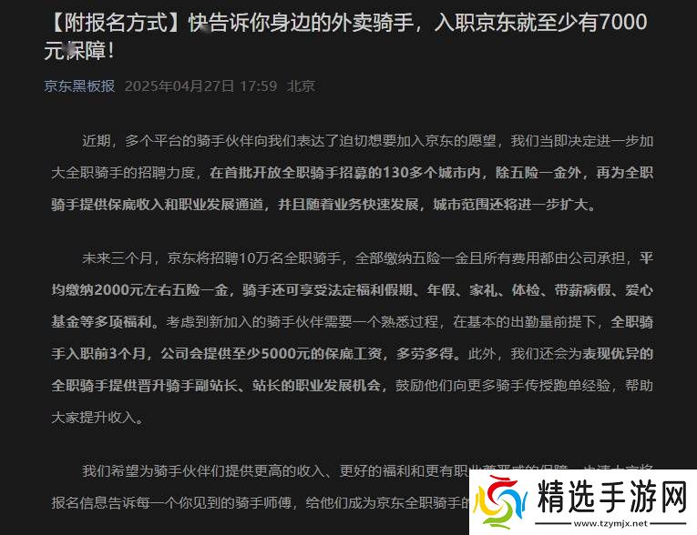 京东近期宣布了一项针对外卖骑手的全新福利政策,这一消息引起了广泛关注。根据“京东黑板报”微信公众号的发布,入职京东的外卖骑手将享受到至少7000元的保障措施。