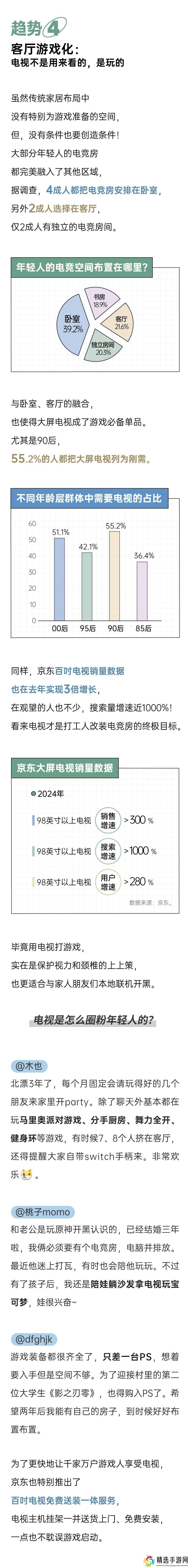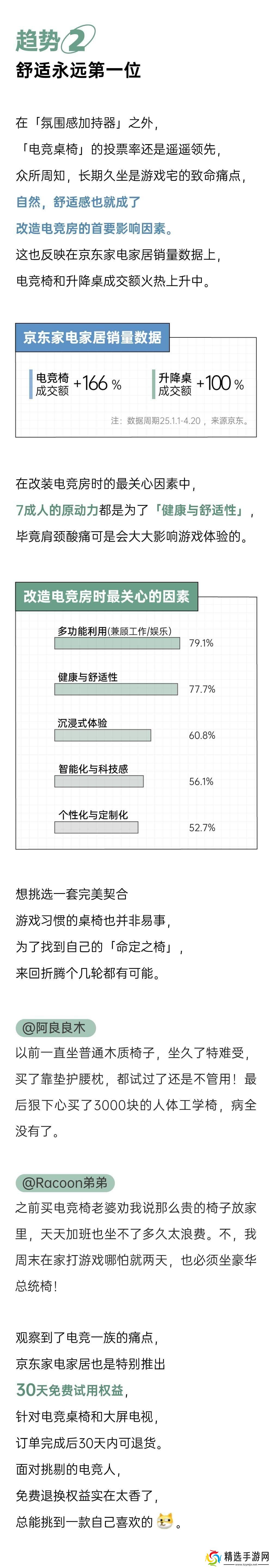 为了满足这一新兴消费趋势,京东家电家居敏锐地捕捉到了市场需求,为电竞爱好者们开辟了专属通道。不仅如此,他们还特别推出了电竞桌椅和大屏电视的30天免费试用服务,让年轻人有足够的时间去调试和布置自己的电竞房,直至找到最完美的游戏角落。