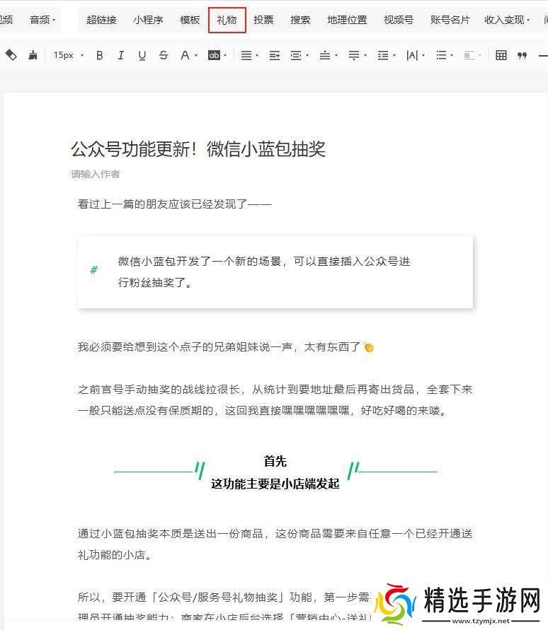 一旦小店端的设置完成,商家可以通过“礼物订单”详情页面查看抽奖的进展情况。随后,公众号或服务号的作者便可以直接从后台发起抽奖,通过选择已绑定的小店中的可用礼物,将其插入到文章中。