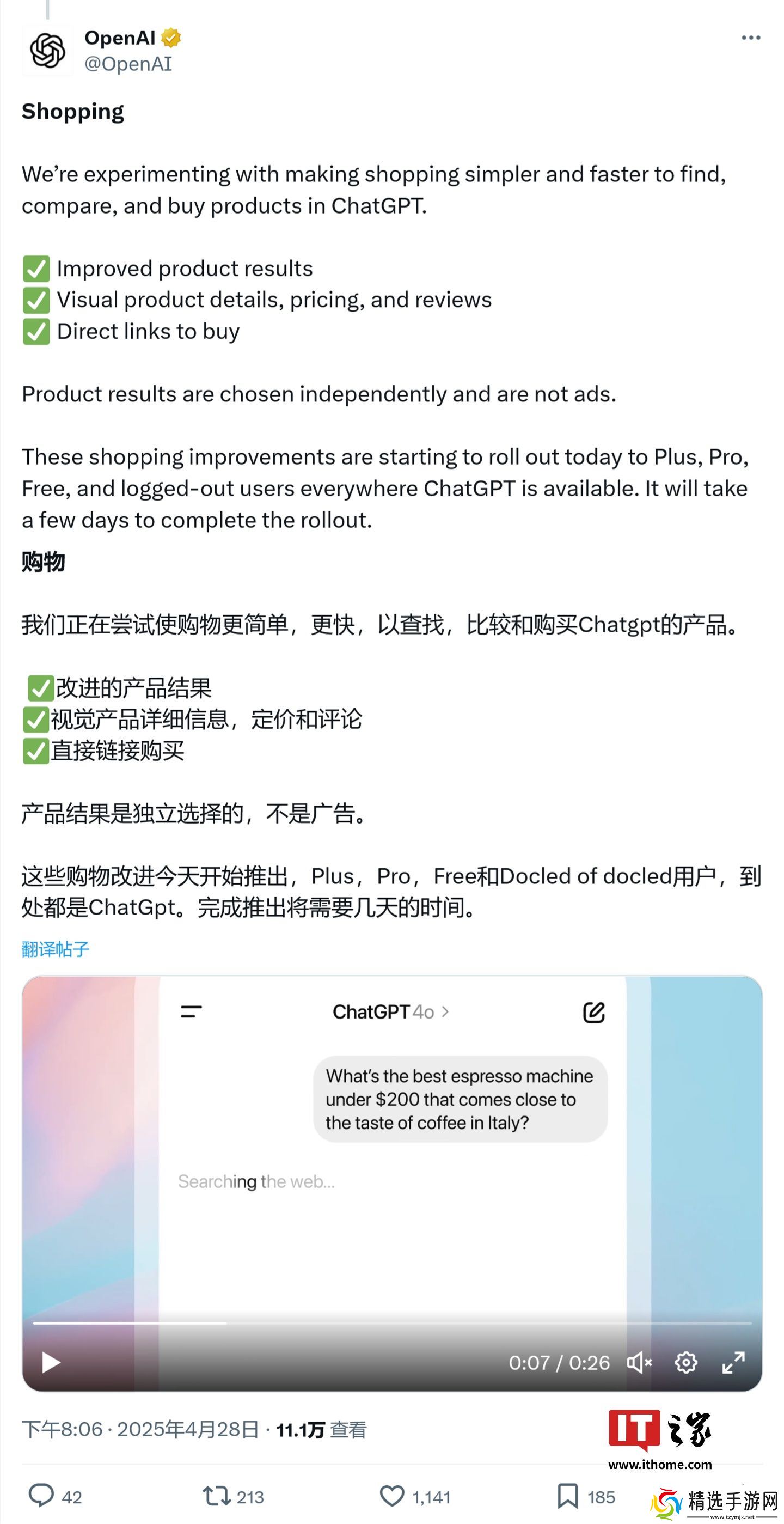 本站 4 月 29 日消息,OpenAI 公司今天(4 月 29 日)在 X 平台发布推文,宣布增强 ChatGPT Search 搜索体验,新增购物功能,首批覆盖时尚、美妆、家居用品和电子产品等类别。