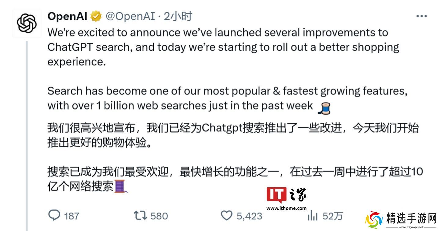 此外,OpenAI 还为 ChatGPT Search 增加了改进引文、趋势话题、自动补全及 WhatsApp 搜索等新功能,进一步提升用户体验。