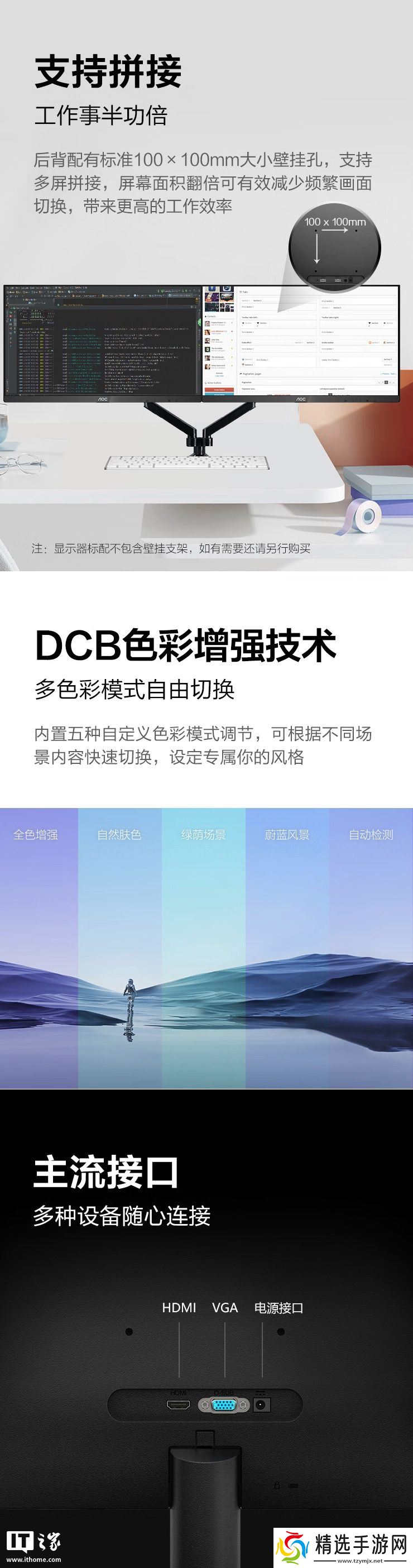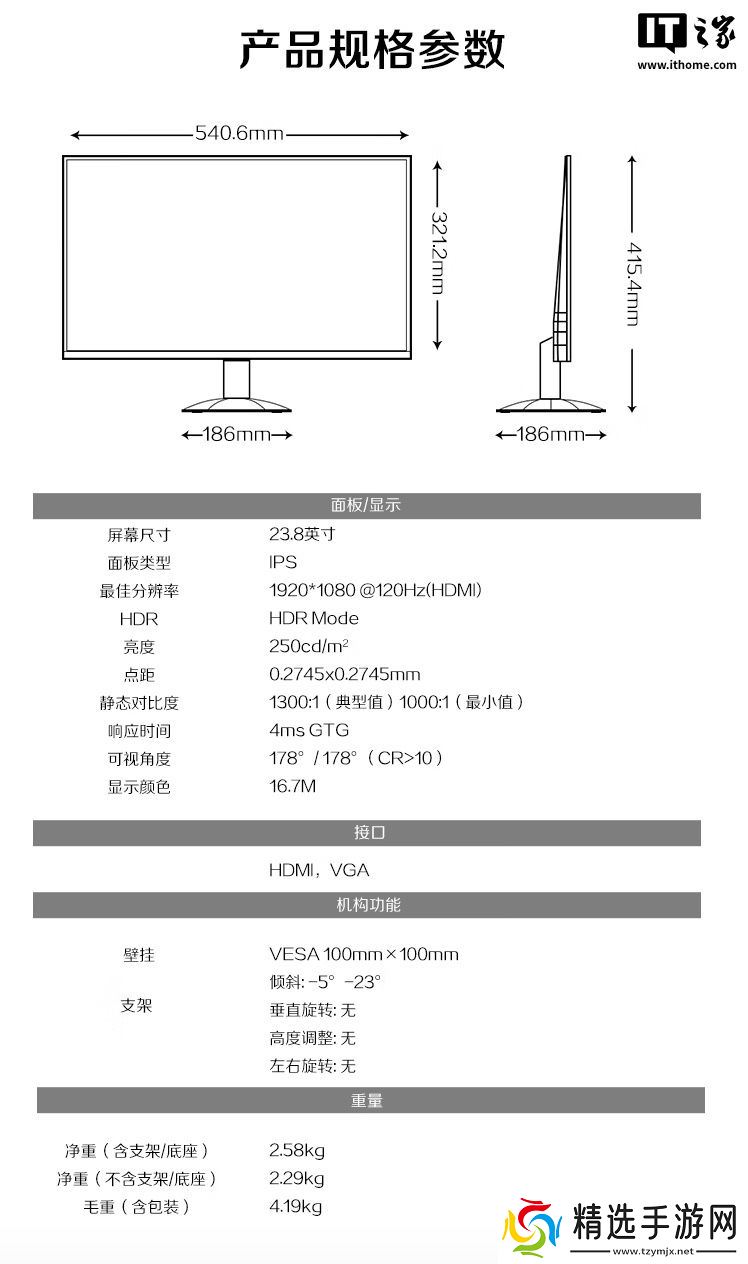 该显示器支架支持倾斜,支持 VESA 100x100mm壁挂,提供HDMI和 VGA接口。