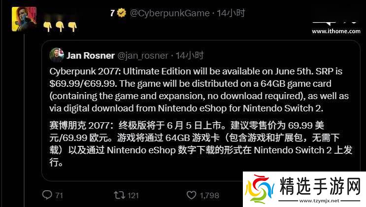 近日,备受期待的《赛博朋克 2077:终极版》宣布将登陆任天堂即将发布的Switch 2平台,并与新主机同步上市,具体日期定为6月5日。这一消息无疑为众多玩家带来了惊喜。