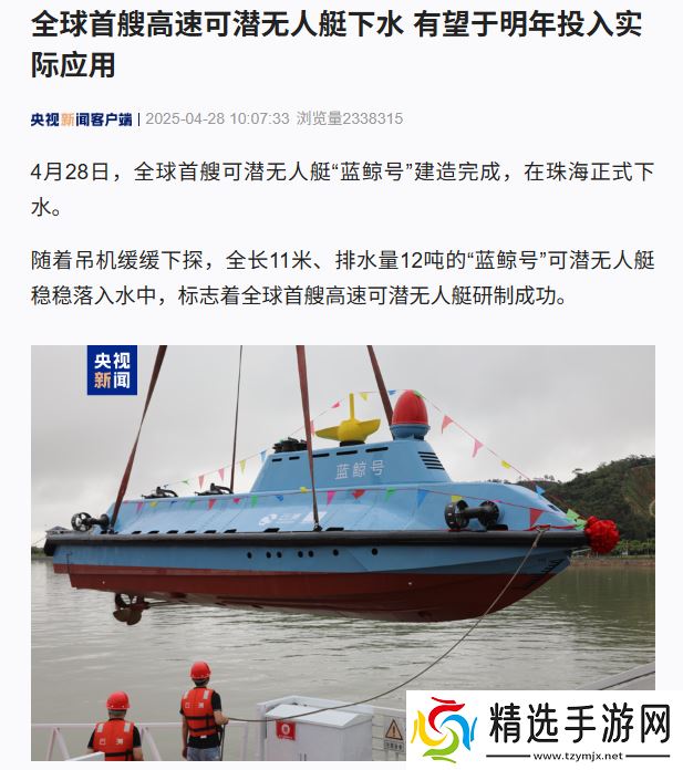 本站 4 月 29 日消息,据央视新闻报道,4 月 28 日,全长 11 米、排水量 12 吨的可潜无人艇“蓝鲸号”建造完成,在珠海正式下水,标志着全球首艘高速可潜无人艇研制成功。